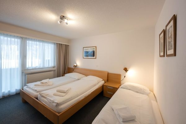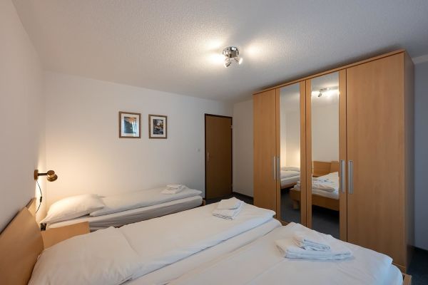 2½-Zimmerwohnung Nr. 103, im Erdgeschoss, für 5 Personen, ca. 64m², Sitzplatz Süd; Parkplatz Nr. 19 (Wg 103) in Einstellhalle, weitere Parkplätze müssen dazu gemietet werden CHF 70.-- pro Woche; zur Mitbenützung: Waschküche, Skiraum, Aufzug/Lift, Sauna (nicht im Mietpreis inbegriffen), Hinter dem Haus Kinderspielplatz; sehr grosser Wohnraum mit Polstergruppe, Essecke, 2 Klappbetten, TV, WLAN; Schlafzimmer mit Doppelbett (2 normale Matratzen) und 1 Bett; offene Küche mit 4-Plattenherd, Kühlschrank mit Tiefgefrierfach, Backofen, Geschirrspüler, Kapsel-Kaffeemaschine; Bad/Dusche/WC; Bettwäsche, Küchentücher, Frotteewäsche, Duvet nordisch; Babybett und Hochstuhl auf Anfrage (CHF 35.--); Nichtraucher Wohnung; Haustiere sind erlaubt! Auf Anfrage können Kinderbetten und Baby Hochstühle sowie Zewi-Decken dazu gemietet werden.