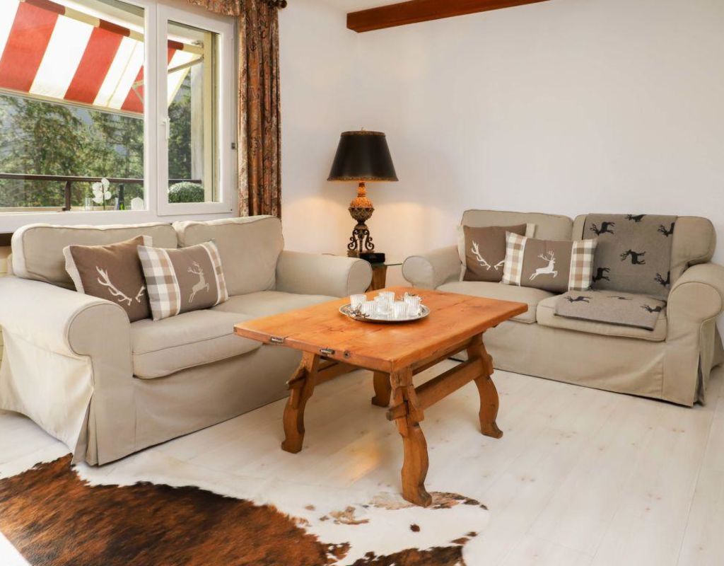 3-Zimmer-Wohnung 80 m2 im 4. Stock, Ostlage; Parkplatz beim Haus; zur Mitbenutzung: Restaurant, Bar, Lift, Skiraum, Waschmaschine, Wäschetrockner (extra), Skischuhtrockner, Brötchenservice, Getränkeservice und Frühstück möglich, Parkplatz, Gemeinschaftsgarage max. 210cm Höhe (extra); sehr schön und geschmackvoll eingerichtet; Wohn-/Esszimmer mit Esstisch, Kabel-TV und Flachbildschirm, WLAN; Ausgang zum Balkon, Richtung Osten; 2 Zimmer, jedes Zimmer mit 2 Doppelbetten (2 x 90 cm); Küche mit Backofen, Geschirrspüler, 4 Glaskeramikherd Platten, elektrische Kaffeemaschine; Bad oder Dusche/WC, Doppelwaschbecken; Parkettböden; schöne Sicht auf die Berge und Park; Bettwäsche, Frotteewäsche, Küchentücher; Haustiere nicht erlaubt; Nichtraucher-Unterkunft. Rollstuhl max 70cm erreichbar, Badezimmer Türe 75cm