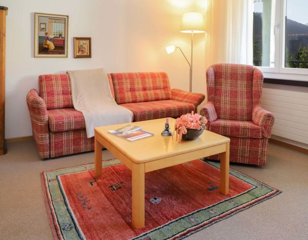 2-Zimmer-Wohnung 55m2 im 7. Stock; Südlage; Balkon mit sehr schöne Sicht auf die Berge und die Ortschaft; zentrale und ruhige Lage; zur Mitbenutzung: Restaurant, Bar, Lift, Skiraum, Waschmaschine, Wäschetrockner (extra), Skischuhtrockner, Brötchenservice, Getränkeservice und Frühstück möglich, Parkplatz, Gemeinschaftsgarage max. 210cm Höhe (extra); hell, schön und gemütlich eingerichtet; Wohn-/Esszimmer mit 1 Doppel Diwan Bett, Kabel-TV, Flachbildschirm und Radio, WLAN, Telefon, Ausgang zum Balkon; 1 Zimmer mit 1 Doppelbett (2 x 90 cm); offene Küche mit Backofen, Geschirrspüler, 4 Glaskeramikherd Platten; Bad/WC; Bettwäsche, Frotteewäsche, Küchentücher; Haustiere nicht erlaubt; Nichtraucher-Wohnung! Rollstuhl max 70cm erreichbar, Badezimmer Türe 75cm.