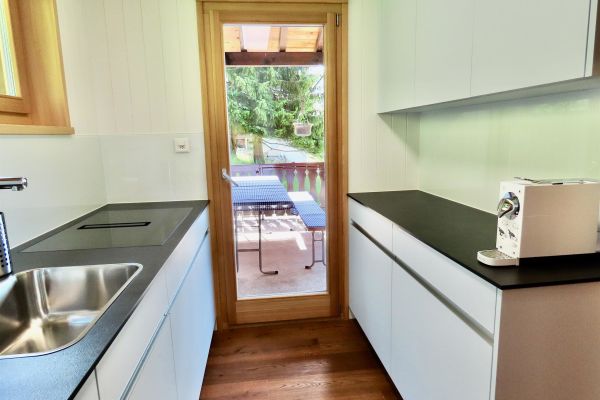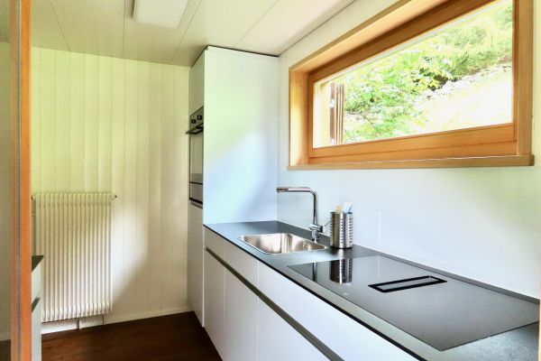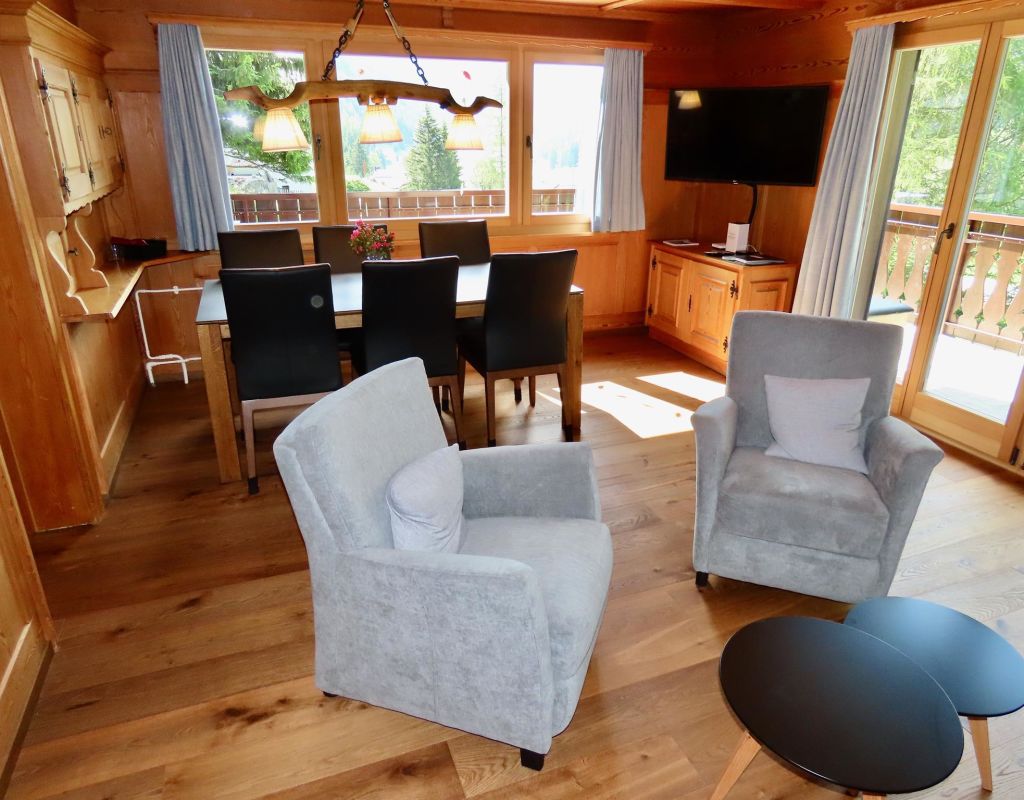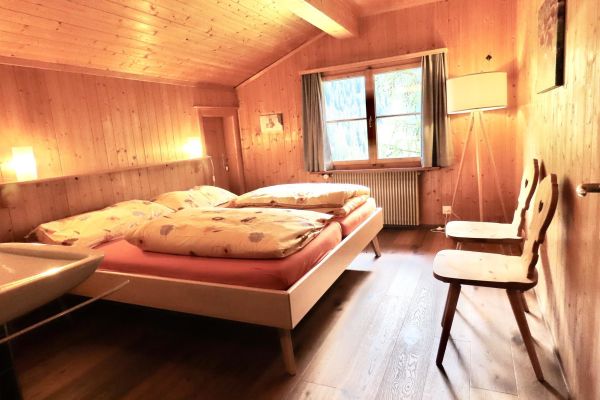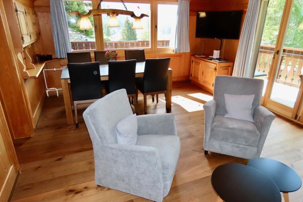 5.5-Zimmer-Einfamilienchalethaus Nr. 38, für 6-8 Personen, ca. 99 m²; überwiegend Panorama Sicht; Balkon/Terrasse Süd/West (20 m2), von Wiesen umgeben/grosser Garten; 1 Garage, 1 Aussenparkplatz vor Garagentor; Erdgeschoss: Wohnraum mit Esstisch (ausziehbar), Swisscom-TV, WLAN, Kamin; 1 Schlafzimmer mit Doppelbett (1 Matratze, 160x200); separate Küche mit Fenster, mit 4-Platten Glaskeramikherd (Induktion), im Herd integrierter Dampfabzug, Kühlschrank mit Tiefgefrierfach, Mikrowelle, Backofen, Geschirrspüler, Kapsel Kaffeemaschine (Delizio); Dusche/WC; Obergeschoss: Treppe in den 2. Stock 1 Schlafzimmer mit Doppelbett (2 Matratzen, 90x200) und Lavabo, 1 Schlafzimmer mit 2 Betten, 1 Schlafzimmer mit Doppelbett (2 Matratzen, 80x200); sep. WC und Lavabo; Untergeschoss: Waschmaschine und Tumbler; Bettwäsche, Küchentücher, Frotteewäsche, Duvet nordisch; Haus ohne Teppich sondern Parkettboden; Haustiere willkommen; Nichtraucher Wohnung; Leinenpflicht für Hunde auf dem Grundstücksgelände (Waldzone);