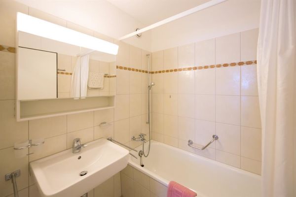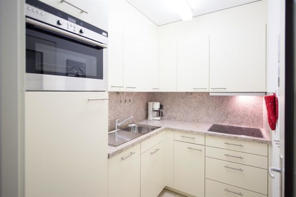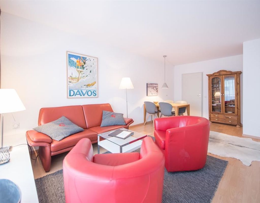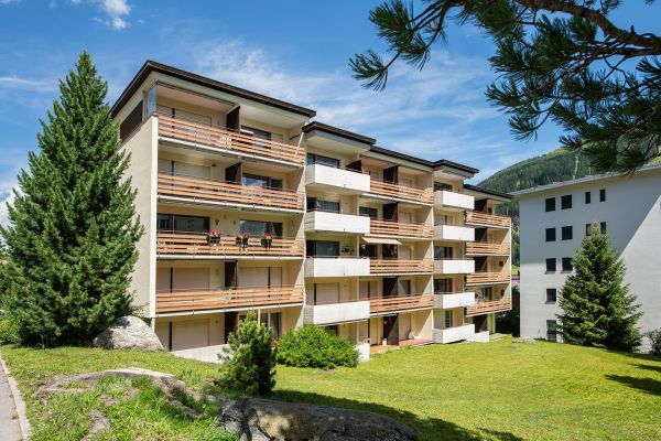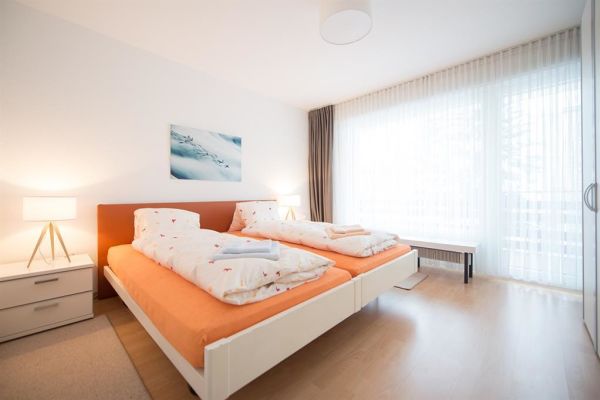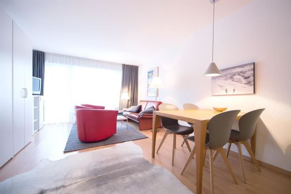 2-Zimmerwohnung Nr. 45, Etage 2, für 4 Personen, ca. 63m², Balkon Süd/West;zur Mitbenützung: Waschküche, Skiraum, Aufzug/Lift, Sauna (nicht im Mietpreis inbegriffen), Hallenbad (im Mai und November geschlossen), Hinter dem Haus Kinderspielplatz; Parkplatz Nr. 45 in Einstellhalle; Wohnraum mit Polstergruppe, Essecke, 2 Klappbetten, TV, WiFi; 1 Schlafzimmer (½ Stock tiefer) mit Doppelbett (2 Matratzen); separate Küche mit 4-Plattenherd, Kühlschrank mit Tiefgefrierfach, Backofen, Geschirrspüler; Bad/Dusche, sep. WC; Bettwäsche, Küchentücher, Frottéewäsche, Duvet Nordisch; Haustiere nicht gestattet; Wohnung ohne Teppich - Laminatboden; Nichtraucher-Wohnung!