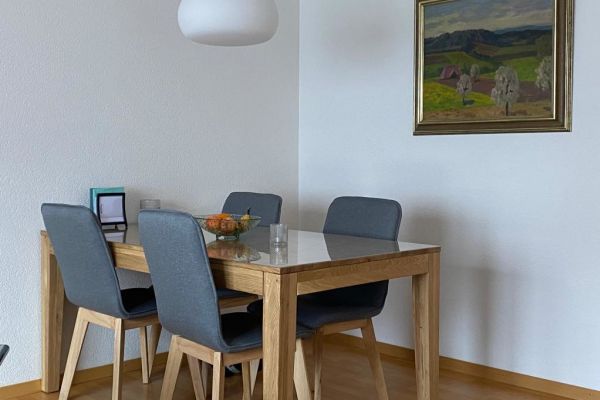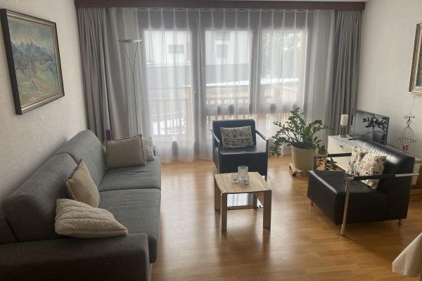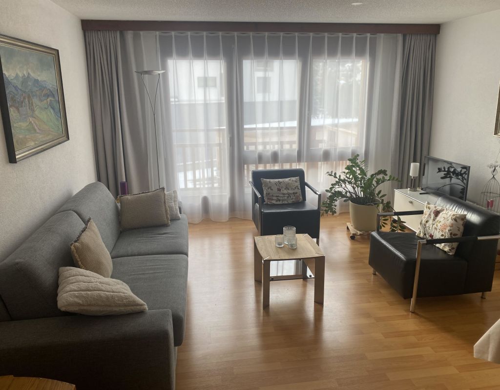 2.5-Zimmerwohnung Nr. 23, Etage 2, für 4 Personen, ca. 64 m²; Teilweise Panorama Sicht; Balkon Süd; Garage in Einstellhalle Nr. 4; zur Mitbenützung: Waschküche, Aufzug/Lift (auf halber Etage); Wohn-, Schlafraum mit Sofabett (160 x 200), Essecke, TV, WiFi; 1 Schlafzimmer mit Doppelbett (2 Matratzen, 90x200); separate Küche mit Dampfabzug, mit 4-Plattenherd, Kühlschrank mit Tiefgefrierfach, Backofen, Geschirrspüler, Kapsel Kaffeemaschine (Nespresso); Bad/WC; Wohnung ohne Teppich sondern Laminat; Bettwäsche, Küchentücher, Frotteewäsche, Duvet nordisch; Haustiere sind erlaubt; Nichtraucherwohnung!