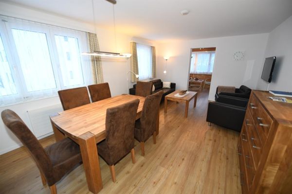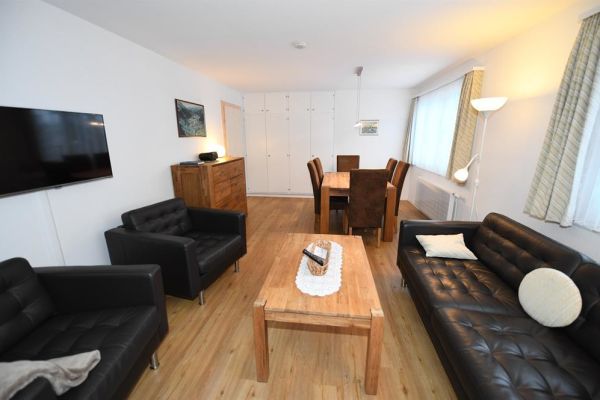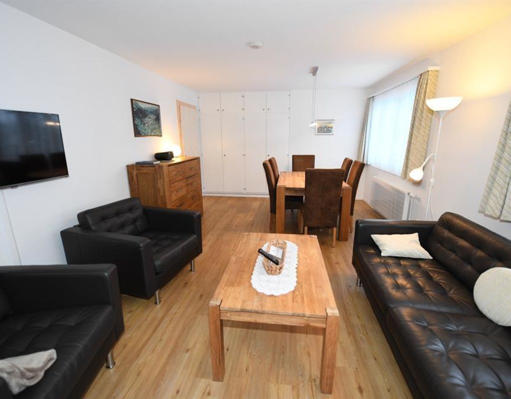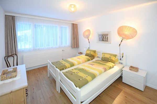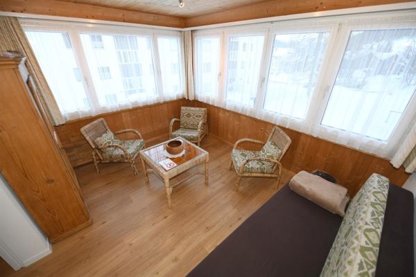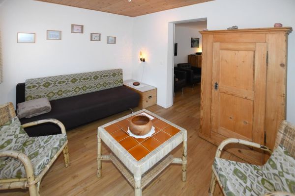 3 1/2-Zimmer-Wohnung (90m2), ganze 2. Etage eines Zweifamilienhauses an ruhiger, sonniger Lage, Parkplatz (Sommer) oder Garage (Winter, Höhe 2,85m), zur Mitbenützung Garten, Waschmaschine, Trockenraum; eigener Skiraum (für Jacken und Schuhe); sep. Küche mit Backofen, Kühlschrank, Geschirrspülmschine, Kaffeemaschine und Toaster, Fondue- und Raclettegeschirr; Bad/WC und separat Dusche/WC; 2 Schlafzimmer mit insgesamt 5 Einzelbetten, Kinderbett; Südloggia mit Sitzgruppe; Bettwäsche und Küchentücher (Frotteewäsche bitte selber mitbringen!); Duvet mit Daunen und synthetische Duvets Nordisch, Tischtücher; Telefon, Radio, TV; Abfallsäcke (blau) gegen Gebühr, 2 Rollen WC-Papier pro WC; Nur für Nichtraucher, keine Haustiere
