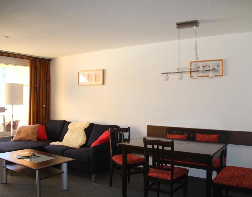2 Zimmerwohnung (50m2) im Hotel Europe integriert, zentrale Lage, Hotelkomplex mit Lift, Tiefgaragenstellplatz, Skiraum; Mitbenützung der Waschmaschine, Tumbler, Hallenbad und Garten mit Spielplatz; Wohnung mit Balkon (ost), sep. Küche (neu 2022) mit Backofen, Kühlschrank, Geschirrspülmaschine, Filter-Kaffeemaschine; Bad/WC und sep. WC; 1 Schlafzimmer mit 1 Doppelbett (2 Matratzen), 1 Wohnschlafzimmer mit 1 Schrankbett, 1 Kinderbett bis 3 Jährig auf Wunsch; Teppichboden; Bettwäsche, Küchentücher, Frotteewäsche, Duvet mit Daunen, Radio, TV, gratis WLAN; Haustiere: nur Hunde; Nichtraucherwohnung!