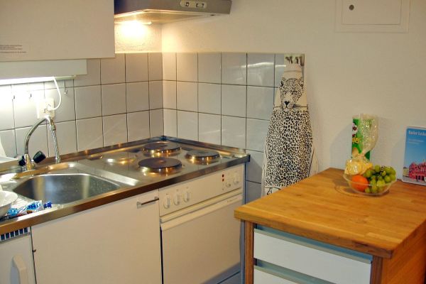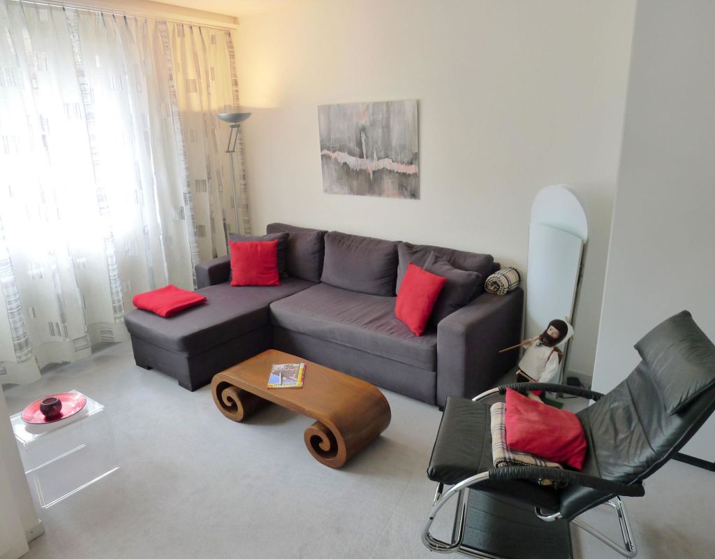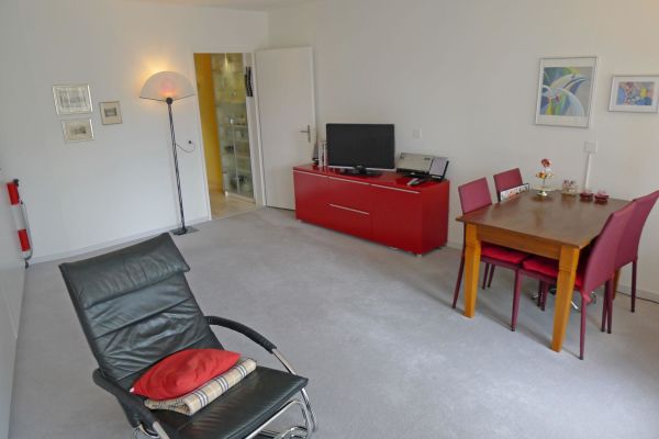 1-Zimmer-Wohnung 47m2 im 5. Stock; am Ortsrand, ruhige, sonnige, erhöhte Lage am Hang; Lift; Balkon, Südlage mit schöne Sicht auf die Berge, die Landschaft und die Ortschaft; Mitbenützung des Skiraumes, Aufenthaltsraum, Bar, WLAN, Tischtennis, Spielzimmer, Sauna (extra), Solarium (extra), Parkplatz (extra), Garage (extra - limitierte Anzahl Plätze, auf Anfrage buchbar); gemütlich eingerichtet: Wohn-/Esszimmer mit 2 Wandschrankbetten und Kabel-TV (Flachbildschirm), Radio, Ausgang zum Balkon; kleine Küche mit 3 Kochplatten, Backofen; Bad/WC; Bettwäsche, Frotteewäsche, Küchentücher; max. 1 Haustier erlaubt; Nichtraucher-Wohnung!