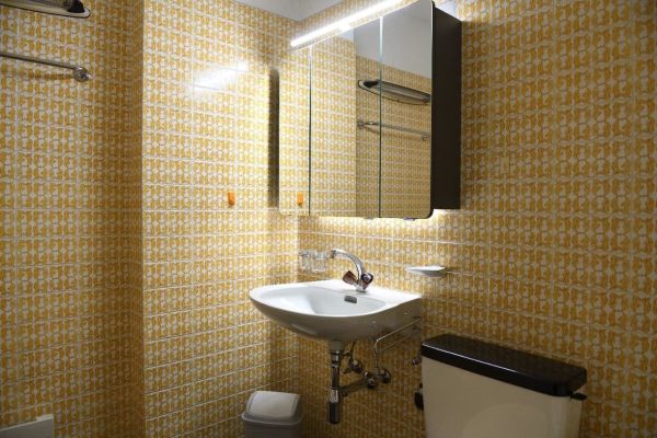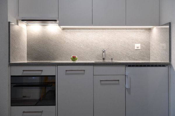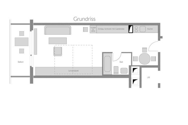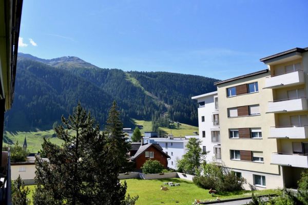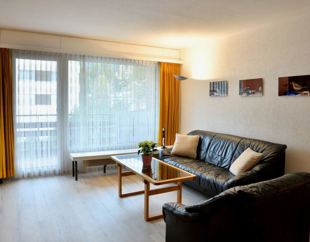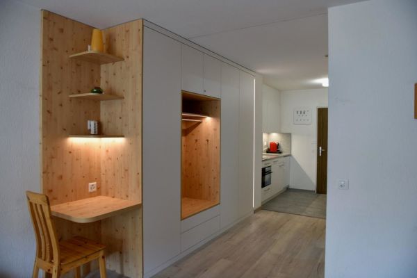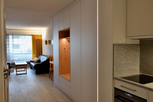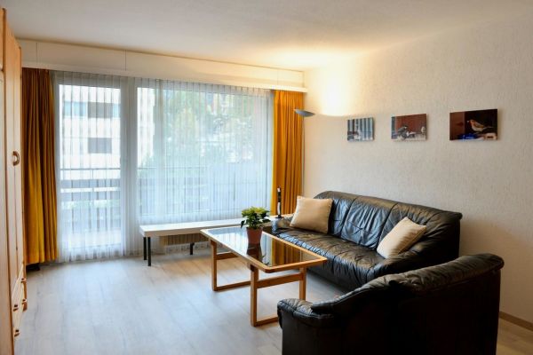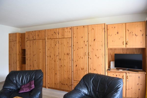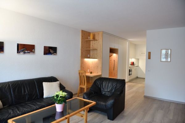 1 ½ room holiday flat, approx. 35m2, apartment building 2. floor, very quiet location, (NEW 22/23: kitchen, floor coverings and built-in wardrobe), open-plan kitchen, dining area, bath/WC, balcony south/west, double cupboard bed, upholstered suite, non-smoking flat, TV and WiFi, bed linen, kitchen towels, towelling, hanging dryer, iron, ironing board, hoover, 2-burner induction hob, oven, microwave, fridge with freezer compartment, dishwasher, kettle, egg cooker, fondue caquelon, raclette/grill, coffee machine, 1 waste bag blue, parking space in garage, lockable box for ski and hiking equipment, indoor swimming pool (closed in May and November), sauna by prior arrangement, shared use of laundry room, lift, 1 dog allowed; children's playground at the house.