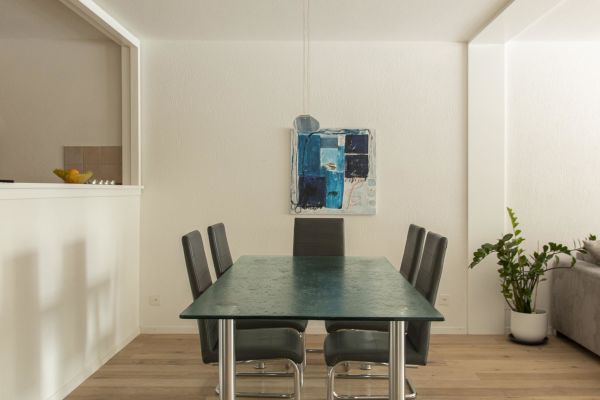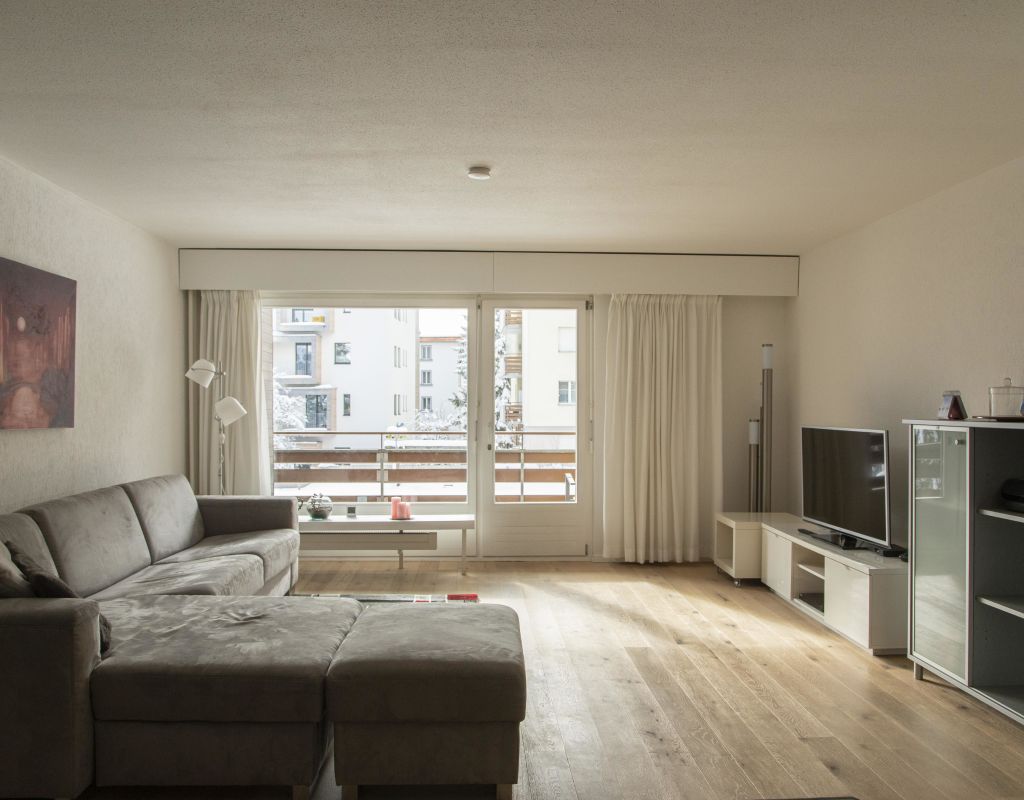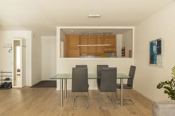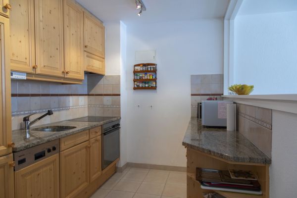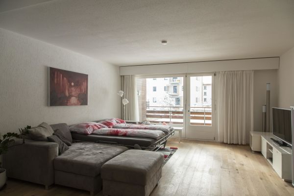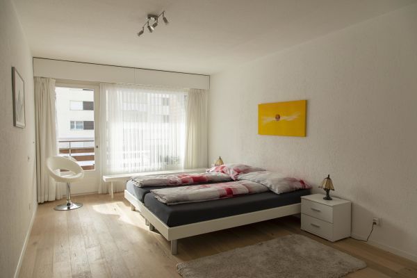 Very large 2 ½ room apartment (app. 75m2) on the 2nd floor of an apartment house with elevator; south facing balcony; underground parking; ski storage room; parking for bicycles / pushchairs; shared use of washing machine, children's playground and the indoor pool; kitchen with oven, fridge with freezer, microwave, dishwasher, coffee machine; shower / toilet, separate toilet; bedroom with 2 single beds; living room with a very comfortable sofa bed (160/200), dining area, TV, telephone, WiFi; bed linen, bath towels, kitchen towels; pets are not allowed; nonsmoking apartment!