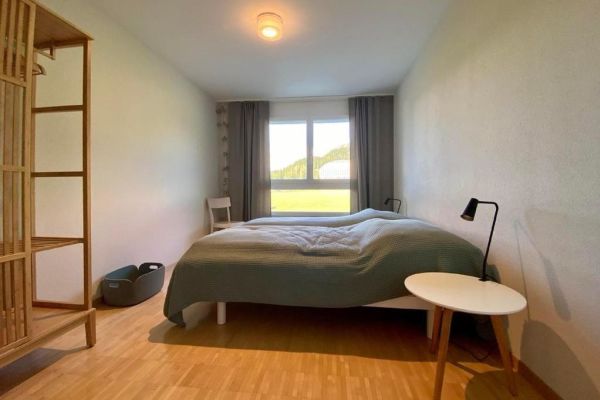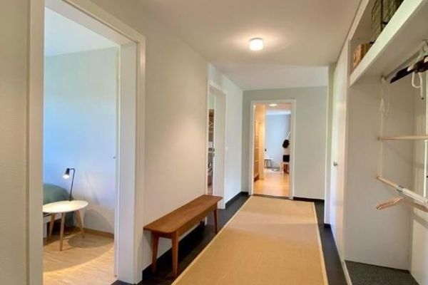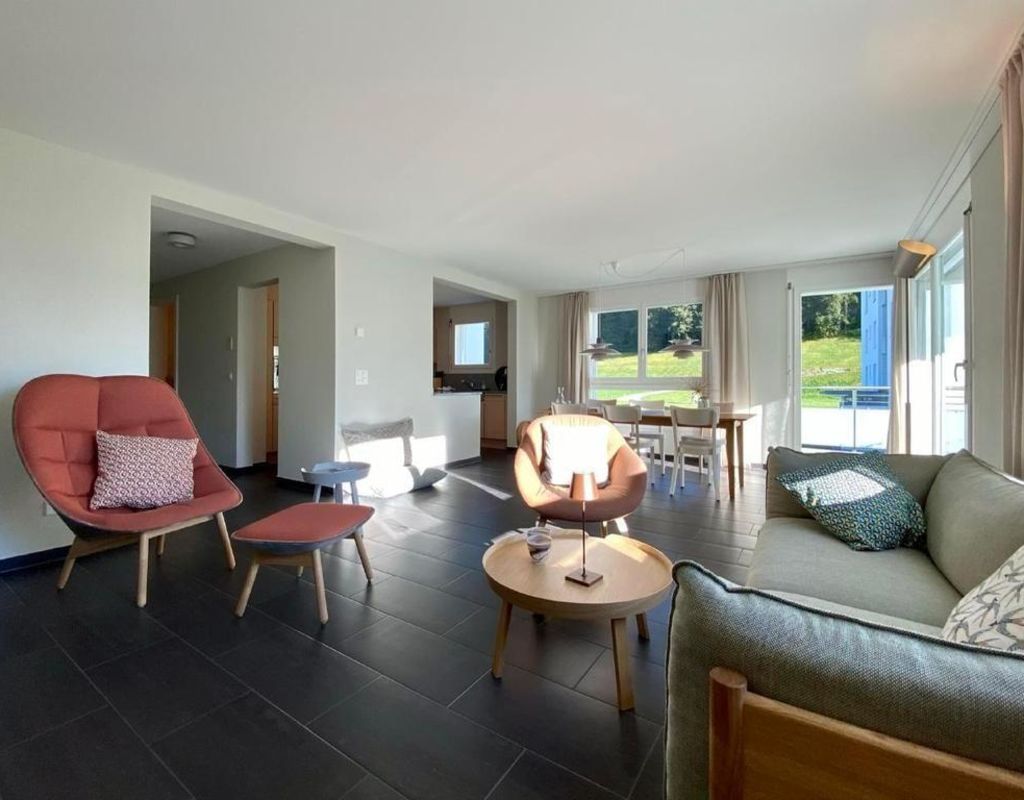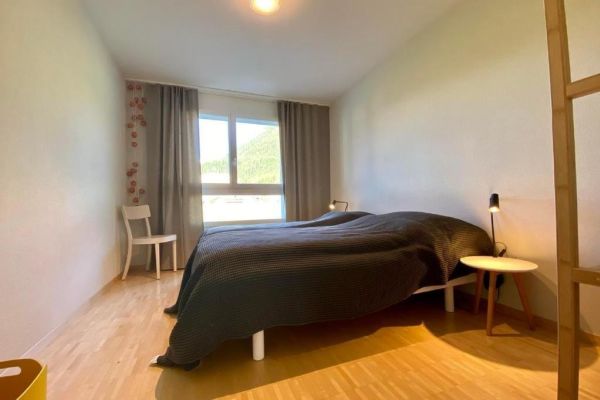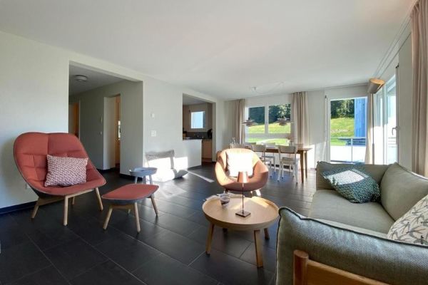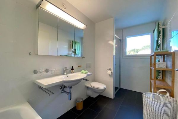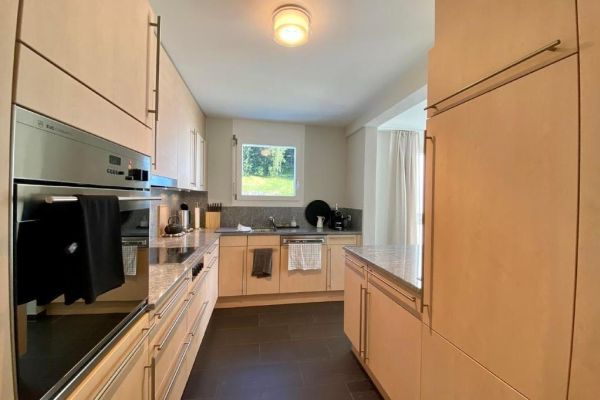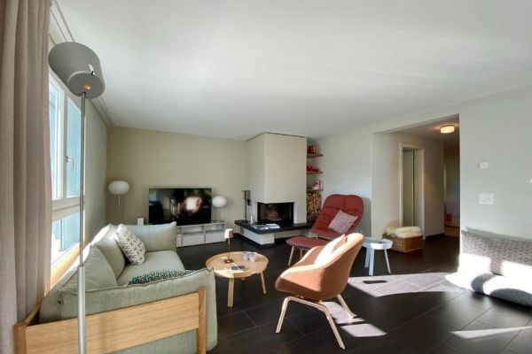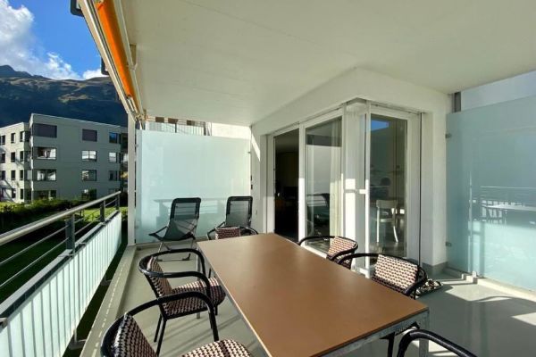 Very bright family-friendly 4.5-room apartment Bünda E11/ "Menti" at the edge of the village near the lake, 133 m², 1st floor, max. 6 persons; partial panoramic view; glazed balcony facing south and west; 2 garage spaces in underground parking 17A and 18A. (Electrical connection with key, inquire with the caretaker); shared use of laundry room, ski room, elevator; living room with sofa and 2 armchairs, generous dining table, TV with Sonos music system, Wi-Fi; 1 master bedroom with double bed (1 mattress, 180x200) with adjacent bathroom (toilet, bathtub, shower), 2 bedrooms each with two single beds (2 mattresses, 90x200); kitchen with hood, with 4-burner glass ceramic stove, refrigerator, freezer, oven, dishwasher, capsule coffee machine (Nespresso); second bathroom with shower/toilet; apartment with parquet and tiled flooring; washing machine and tumbler for communal use; ski and bike cellar; bed linen, towels, kitchen towels, Nordic duvet; non-smoking apartment; pets are not allowed!