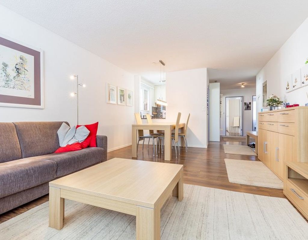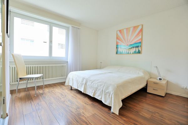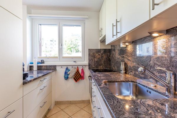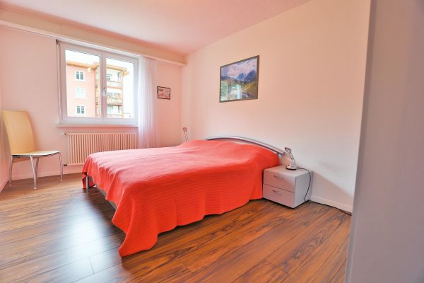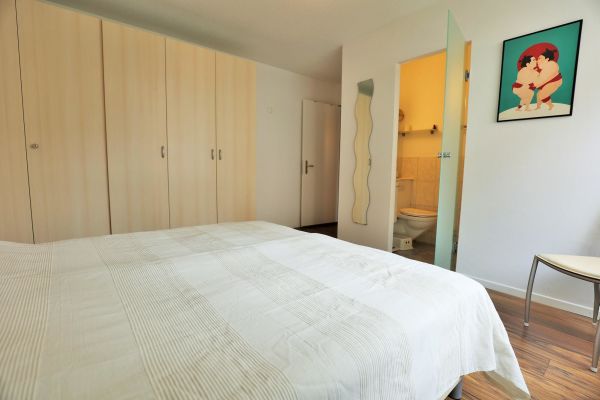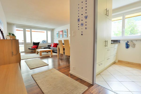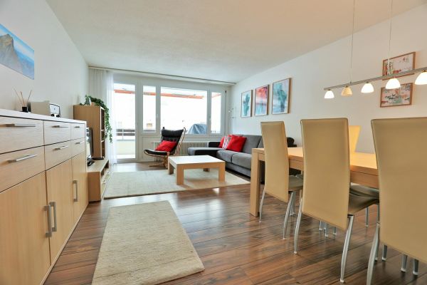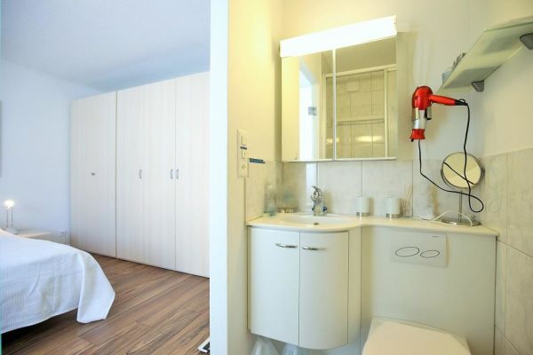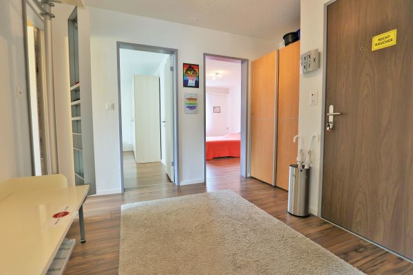 The approx. 75 m2 flat is on the 1st floor and has 2 bedrooms, each with a double bed (2 mattresses each). One bedroom even has an en-suite bathroom with shower/WC. Another wet room offers bath tub/WC. The cosy living and dining room has an upholstered suite, a dining area with Tripp Trapp high chair as well as TV and radio. The semi-open kitchen is equipped with a 4-plate glass ceramic hob, oven, extractor fan, fridge with freezer compartment and a dishwasher. A kettle, toaster, fondue and raclette machine, as well as a capsule (Delizio) and a filter coffee machine are also available. The balcony is south/west facing.