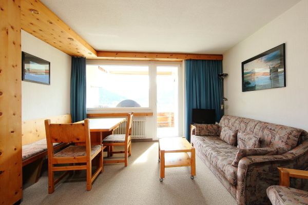 1-room apartment 38m2 on 1st floor; balcony 7 m2, south facing position, beautiful view of the mountains, the countryside and the village; central, quiet, sunny position on the slope, 300 m from the ski area; for shared use: indoor swimming pool, lounge with TV, sauna (extra). Playroom, elevator, ski room, washing machine; bread roll service and beverage service; comfortable and rustic furnishings; living/dining room with 2 wall closet beds and cable TV (flat screen), radio, WiFi, exit to the balcony; kitchenette with oven, 2 glass ceramic stove tops; shower/WC; bed linen, towels, kitchen towels; pets not allowed; non-smoking apartment!