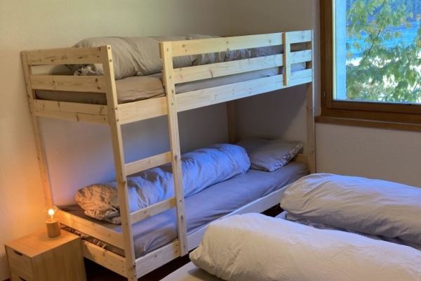 3 1/2 room flats (app. 90m 2) on the ground floor, multi-family house, balcony south-west; car parking space in front of/garage; shared use of ski room, washing machine/tumbler; kitchen with oven, 4-plate ceramic hob, fridge with freezer compartment, dishwasher; bathroom/WC, sep. WC; 1 bedroom with double bed (with a mattress) 160x200, 1 bedroom with double bed (with a mattress) 180x200 and bunk bed 90x200; living room with upholstered suite, dining area, fireplace; bed linen, terry cloths, kitchen towels, duvet nordic; digital TV, fast internet via WiFi, waste bags blue; pets allowed; non-smoking flat!