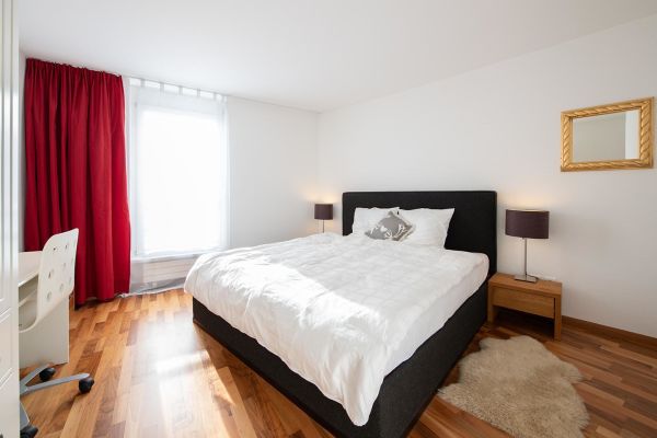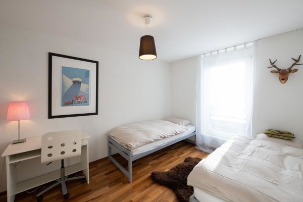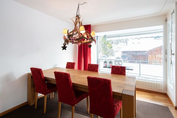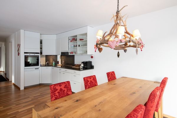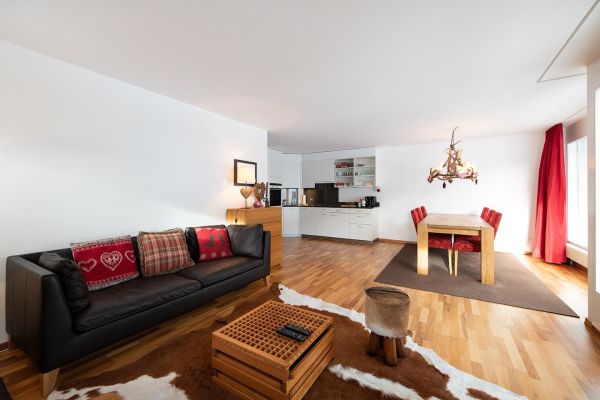 4.5 room apartment nr. 01 on floor 1, 5 persons, about 96 m²; balcony south, garage nr. 6, outside parking left in front of the entrance gate; for shared use: washing room, ski room, elevator; living room with sofas, dining corner, TV, WiFi; 1 bedroom with 2 beds, TV, cross trainer, bath/toilet, 1 bedroom with 2 beds, cot available on request, 1 bedroom with double bed (1 mattress, 160x200); open kitchen with ventilation, 4 plate stove glass ceramic field, oven, fridge with freezer part, dishwasher, coffee machine with capsule; separate shower/toilet; apartment without carpet, with parquet floor; bed linen, kitchen towels, bath linen, nordic cover; non-smoker apartment; pets are allowed!