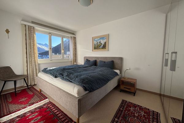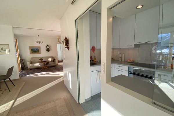 2.5-room apartment No. 6, Floor 2, for 4 people, approx. 69 m²; predominantly panoramic view; South/East balcony; shared use of laundry room, ski room with lockable ski cupboard, elevator; garage in parking garage No. 20; living and sleeping area with sofa bed (140x200 cm), dining corner, Wi-Fi; 1 bedroom with double bed (2 mattresses, 90x180); separate kitchen with extractor hood, 4-burner glass-ceramic stove, refrigerator with freezer compartment, oven, dishwasher, raclette, fondue, iron with ironing board, capsule coffee machine (Café Royal); shower, washing machine and dryer, separate WC; bed linens, kitchen towels, bath towels, Nordic duvet; non-smoking apartment; pets are not allowed.